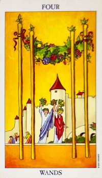 La carte du quatre de bâton du Tarot à l'endroit présente une forme de joie jaillissante. Une forme de célébration de partage et de plaisir de vivre des moments plaisants.